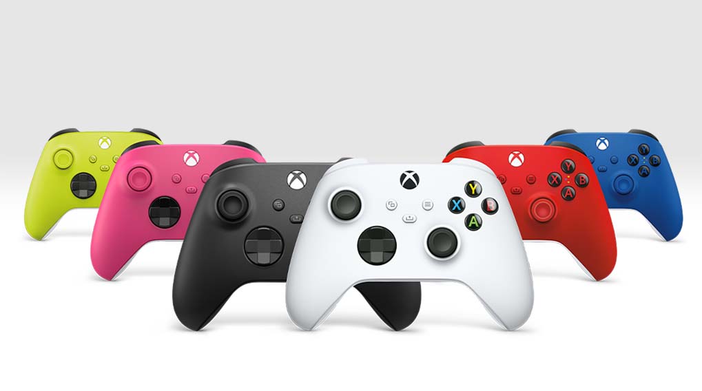 Diverse Xbox-controllers in een cirkel rondom een witte controller. Kleuren: geel, blauw, groen, rood, roze en zwart.