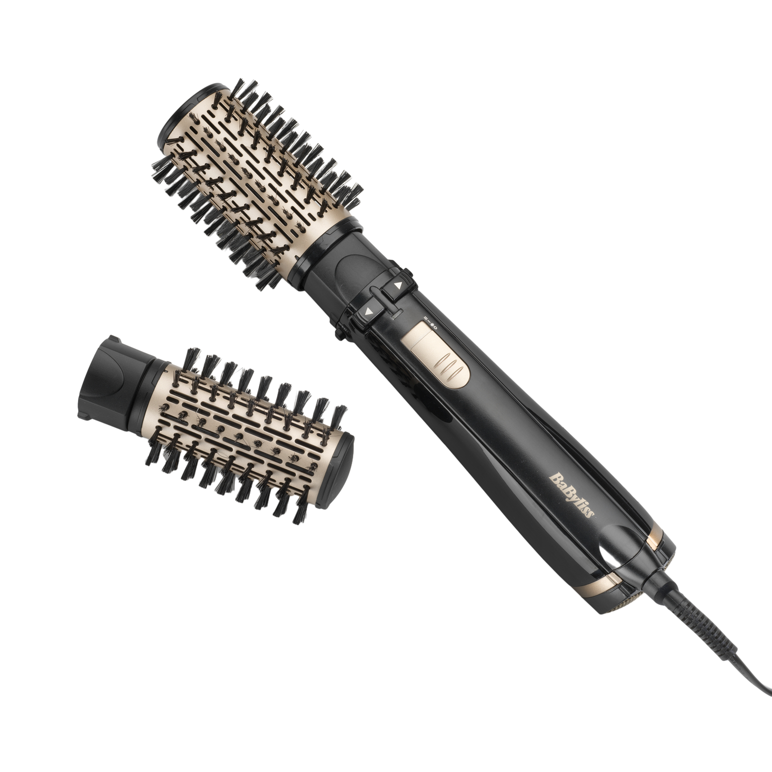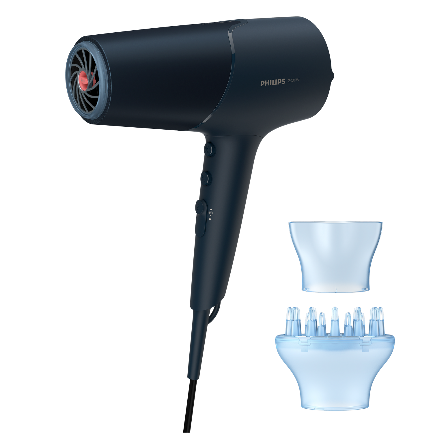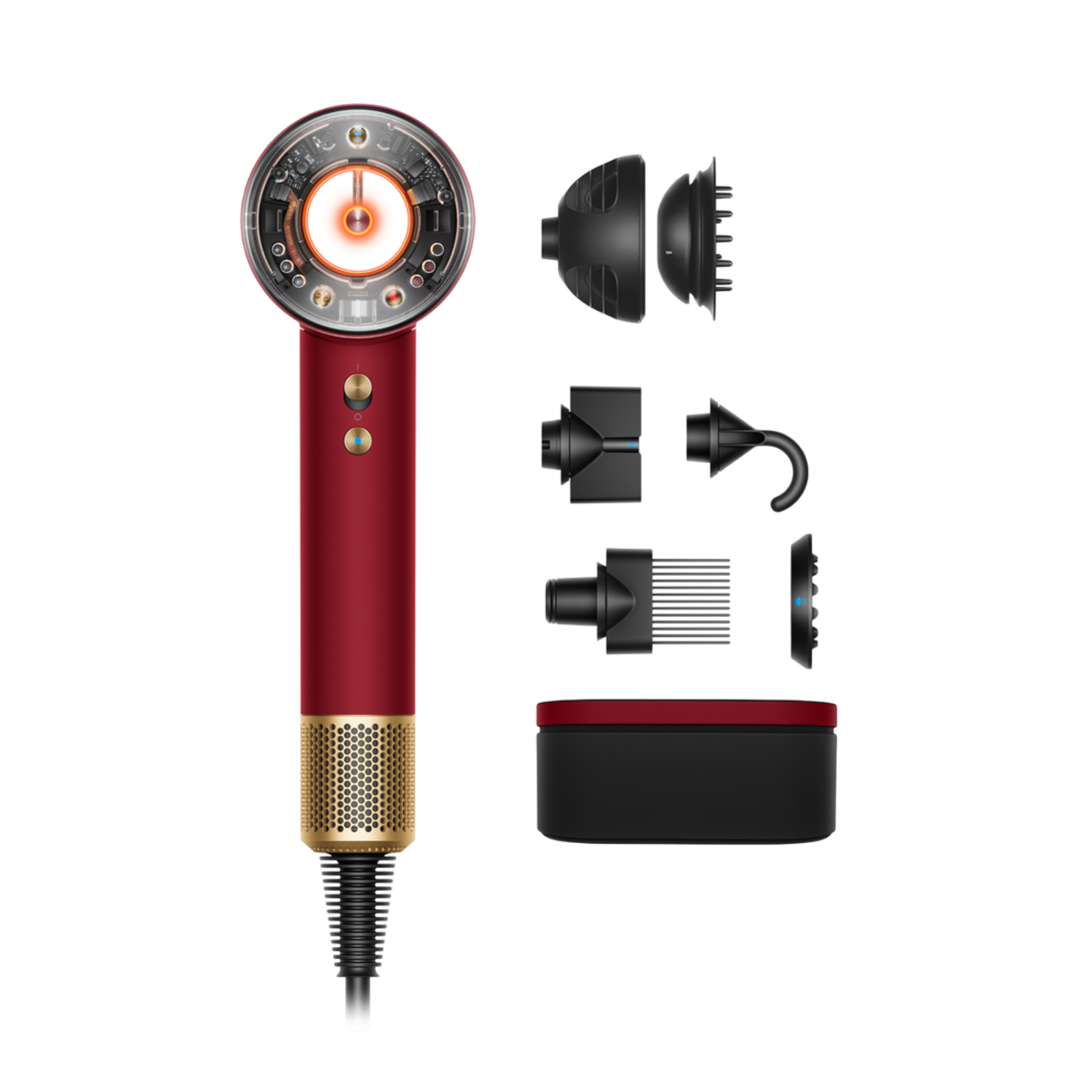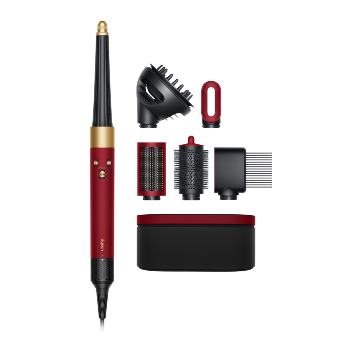 Airwrap, Fast Dryer opzetstuk, Flyaway + Smoother opzetstuk, Conishe Airwrap opzetstuk, 40 mm Airwrap lang opzetstuk, Zachte gladmakende borstel, Grote rond volumseborstel, opbergdoos vinca blauw en filterreinigingsborstel.