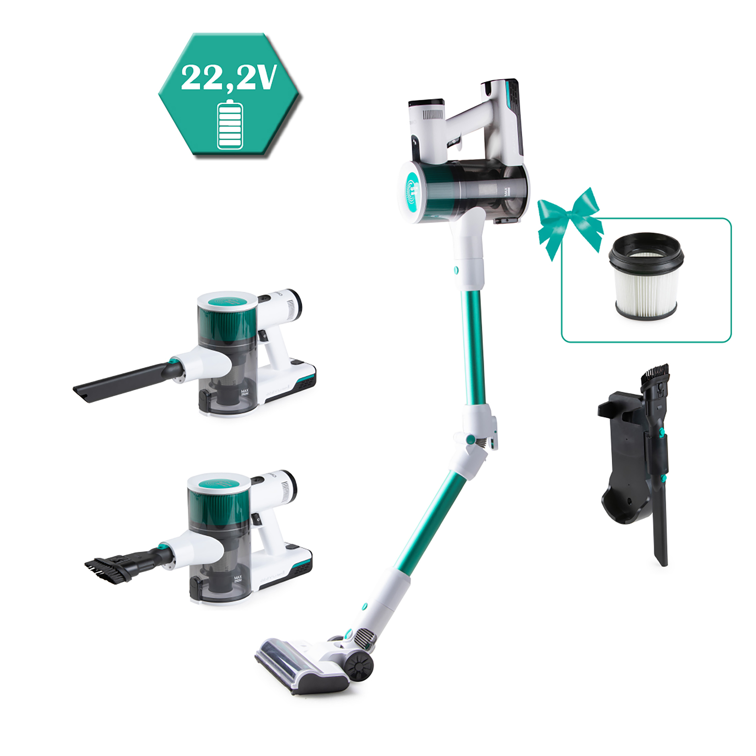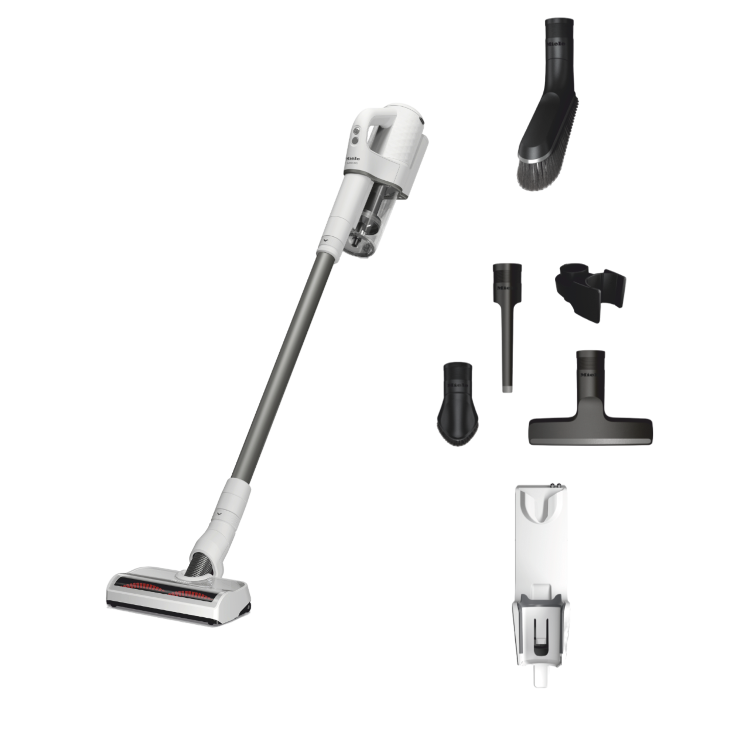 Stofzuiger / Oplaadbasis / Opbergdoos / Schoonmaakborstel / Reserve borstelrol / Vervangingsfilter / Reinigingsoplossing / Handleiding