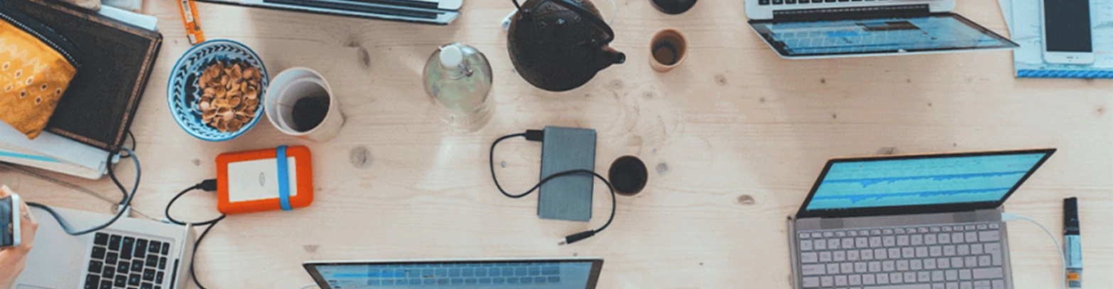 Een groep mensen zit rond een tafel met laptops, papieren en telefoons, bezig met werk of een project.