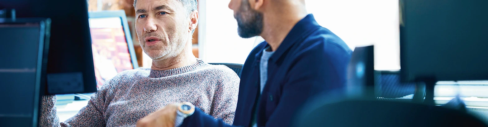 Drie mensen kijken naar twee computerschermen. Een hand wijst naar het scherm. Er is een raam op de achtergrond.